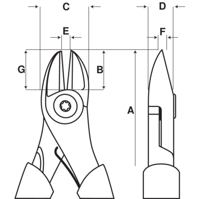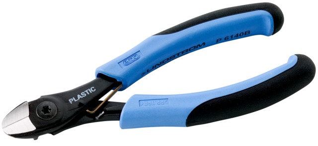 ESD biztos oldalcsípőfogó, külső letörés nélküli vágóéllel (flush). MIndenféle műanyag alkatrész vágásához. . ISO: 5748. Felület: feketére oxidált, korrózió ellen kezelt. Anyaga: Króm-Vanádium acél. ESD biztos Ergo nyél, kétkomponensű műanyagból. Polypropilén, thermoplasztik bevonattal a kényelmes és kiváló fogásért. . Forma: nyitott illesztés szegeccsel, így a vágóél távolsága a forgásponthoz képest kisebb, ez növeli az emelőhatást és a vágó... Dimensions according to ISO 5749 Black finished, anti-corrosion treated Material: high performance alloyed steel. ERGOTM handles with two-material combination, thermoplastic surface on tough polypropylene which gives superior grip Induction hardened cutting edges Full flush cutting edge without bevelling which is designed to smoothly cut all kind of plastic parts such as e.g. the flash of plastic component Screw joint that provides excellent running and accurate alignment of the cutting edges Round shaped jaws give improved accessibility in confined spaces Equipped with a return spring featuring and on/off function Max cutting capacity: Cu 1.5 mm and plastic material PA (Nylon) 3 mm